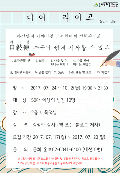 2017년, 서울 은평구의 도서관 강좌 "Dear Life"를 진행한 경험이 있습니다. 당시 수강생들은 자신의 삶을 돌아보며 글을 썼습니다. 이렇게 모은 글이 책이 되었습니다.
